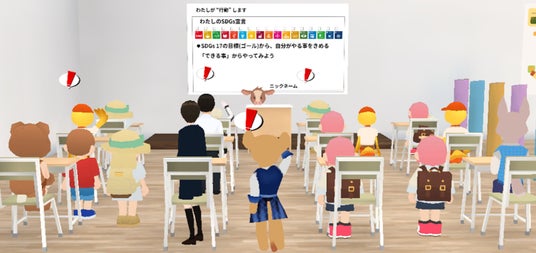 「メタバース空間を利用したラーニングシステム」は、不登校支援や主に海外にルーツがある児童・生徒への日本語指導、先生等による授業や面談、グループワーク、海外との交流授業などに活用されています。3Dのメタバース空間で、アバターによる豊かな表現や、資料・情報の投影など多様なコミュニケーションが可能です。