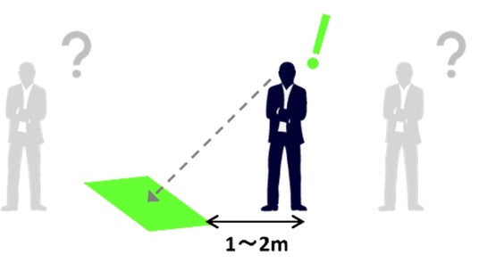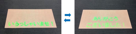 本製品は、緑色に光るホログラムで表示する文字や絵柄が、見る方向によって変わります。商業施設や観光施設など、人々が往来する場所に設置した場合は、行きと帰りで異なる情報を伝えられます。