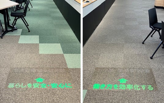 商業施設や観光施設などでは、来場者に視覚的なインパクトを与える情報通知ツールのニーズが高まっています。特に、目的地までの誘導案内やメッセージなどを床面に表示するフロアサインは、視線の低い子供や車椅子の利用者から、背の高い人まで、多様な人々に情報を伝えられます。こうした視覚的なインパクトが大きい一方で、従来のフロアサインの多くは、施設ごとに統一された空間デザインの中で違和感を生じさせやすいという課題がありました。