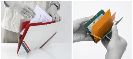 書類などを投げ入れるだけで簡単にファイリングでき、ゴムの伸縮で最適な厚さになるドキュメントホルダー、カードホルダーです。日本で販売している「サンドイット」シリーズをベースにしています。