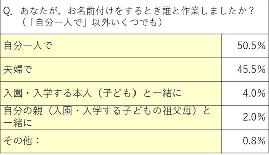 お名前付けを誰と作業したかを尋ねたところ、45.5%が「夫婦で」と回答。時間も手間もかかるお名前付けの作業は、入園・入学前の夫婦の共同タスクとして、協力して作業を進めていることが分かりました。
