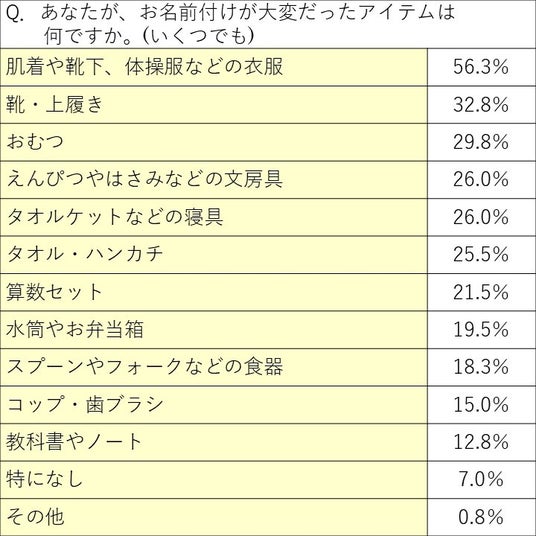 「お名前付けが大変だったアイテム」を尋ねたところ、「肌着などの衣服」が56.3%、「靴・上履き」が32.3%、「おむつ」が29.8%となり、布地など直接名前を書き込みづらいアイテムのお名前付けに苦労していることが分かりました。