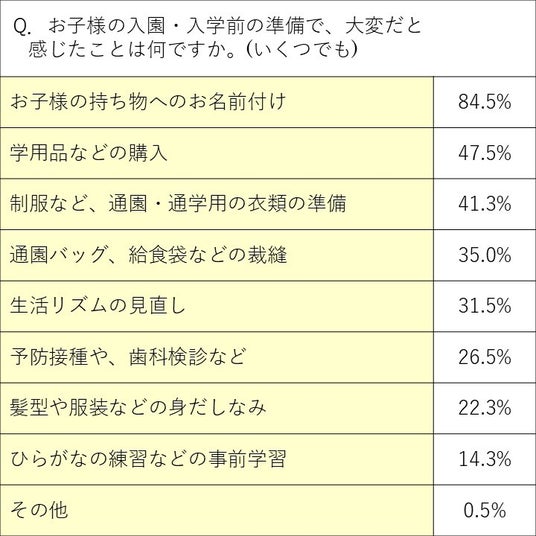 ・84%が入園・入学準備で大変だったことは「持ち物へのお名前付け」と回答。