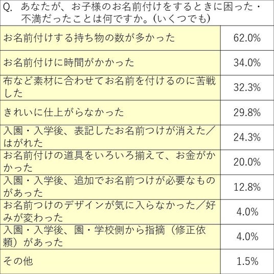 お名前付けをするときに困った・不満だったことを聞いたところ、第1位は「お名前付けする持ち物の数が多かった」(62.0%)でした。次いで「お名前付けに時間がかかった」(34.0%)、「布などの素材に合わせて名前を付けるのに苦戦した」(32.3%)と続き、時間的にも作業内容的にも困りごとが多く発生することが分かりました。