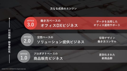 現在、当社のワークプレイス事業は、Office1.0をオフィス家具の製造・販売、Office2.0を空間ベースのソリューション提供ビジネス、Office3.0をデータ活用による働き方ベースのオフィスDXとしてビジネスを展開しています。特にOffice3.0は付加価値が高く競争優位性をもつ次なる成長エンジンと捉えています。