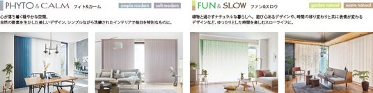 ロールスクリーン「ラルクシールド」は、『ウェルビーイング』をテーマに心の整え方や自分らしい暮らし方を表現した、PHYTO(フィト)・CALM(カーム)・FUN(ファン)・SLOW(スロウ)の4つのカテゴリーをテーマにリニューアルしました。タテ型ブラインド「ラインドレープ」では、モダンテイストの「PHYTO&CALM」、ナチュラルテイストの「FUN&SLOW」の2つのカテゴリーとすることで、テイスト毎に選びやすいラインナップにしました。