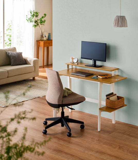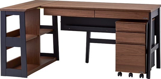組み合わせと組み替えで「じぶん好み」に使えます。デスクは幅1000mmタイプと1200mmタイプの2サイズを展開(奥行き550mm)。周辺製品も、ハイタイプとロータイプのシェルフ(書棚)、とキャスター付きキャビネットをラインナップします。