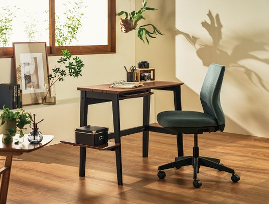 天板と脚はエッジを効かせスッキリとした印象をあたえるデザインで、天板などの主材質には、ホワイトオーク突板(ナチュラル色)、ウォールナット突板(ブラウン色)を使用しリビングや書斎のインテリアにも合わせやすい2タイプのカラーをラインナップしています。