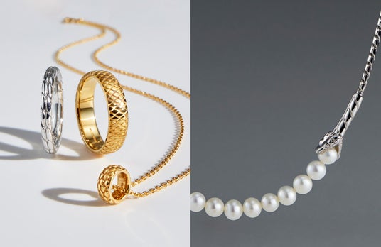 K24を使用したLuxe Goldのシリーズからも干支である蛇をイメージした縁起の良いシリーズが登場。蛇の鱗を丸みのあるアームに落とし込んだネックレスやリングのさり気ないテクスチャーは、日頃のコーディネートにもなじみます。