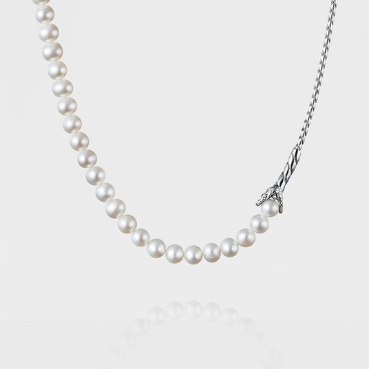 幸運のシンボルとして知られる白蛇のモチーフを表現したシリーズ。純白のパールとしなやかなチェーンで表現したネックレスは、蛇がパールをダイナミックにくわえる姿を精巧にジュエリーに落とし込みました。主役級のアイテムは、一点加えるだけでシンプルになりがちな冬のコーディネートに華やかさをプラスしてくれます。白蛇の鱗を表現したアームにプラチナコーティングを施したリングは程よいボリューム感で手元にアクセントをプラスしてくれます。指通りの滑らかさにもこだわっているので、お守り代わりとして活躍してくれます。