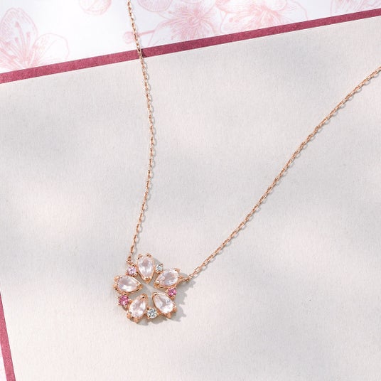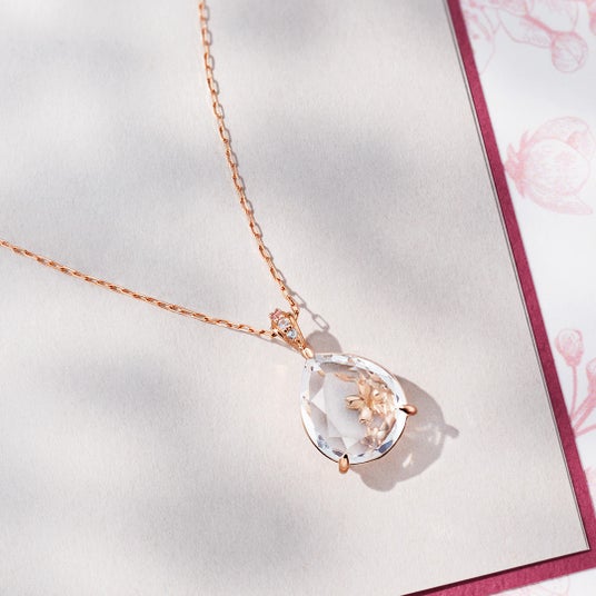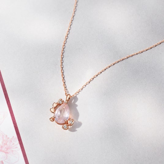 透明感のあるクォーツと桜の繊細な美しさが融合したネックレスは、水面に浮かぶ桜をイメージしてデザインされています。クォーツの下に忍ばせた地金の桜パーツが奥行きのある輝きを演出。遠くからでも、近くでじっくり見たときでも異なる表情を楽しめる、洗練された一品です。