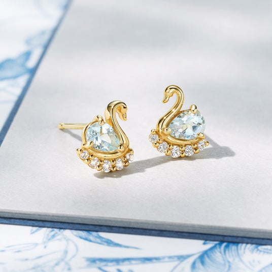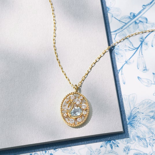 3月の誕生石アクアマリンを使用し、水辺を泳ぐ白鳥をイメージしたネックレスとピアスが登場。水を感じさせるアクアマリンとともに散りばめられたトパーズが輝きを添え、白鳥の頭には王冠を思わせる一石が配されています。