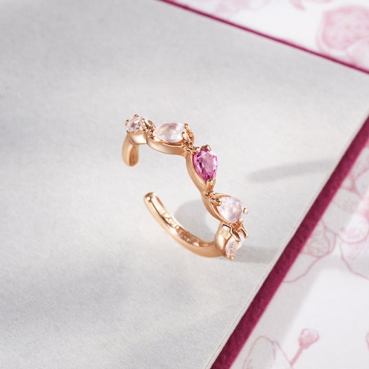 中央に空間を持たせた抜け感のある配置は、軽やかで上品な印象を与え、春らしい爽やかさを演出。また、ピンクトルマリン、ローズクォーツ、ホワイトトパーズの3種類の天然石をグラデーションに配置し、桜の花びらがふんわりと舞うような柔らかな彩りを表現しました。石座同士をリズミカルに配置することで、ジュエリー全体に軽やかさと動きを持たせています。