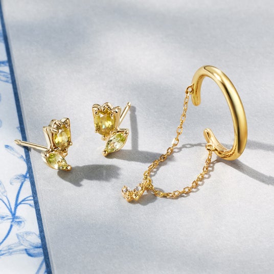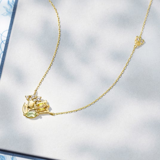 童話「親指姫」をテーマに、誕生を象徴するチューリップや冒険を支える蝶々をデザインに取り入れました。スフェーンを裏からも楽しめるよう、光穴はチューリップの形になっています。また、リングでは蝶々が静かに留まり、ネックレスやピアスでは羽ばたく姿を立体的に表現。まるで蝶々が舞う瞬間を切り取ったようなデザインが魅力です。