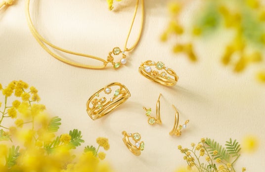 ミモザの花言葉である「感謝」「思いやり」に着想を得たジュエリーは、花びらが重なるような石座のデザインや、ミモザをイメージした柔らかなゴールドの輝きが特徴。ふんわりとした花の質感を繊細なカットやカラーで表現し、優しく可憐な印象を演出します。ピアスやネックレス、リングなど、シーンを問わず身に着けやすいアイテムを豊富にラインナップ。