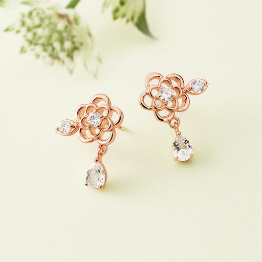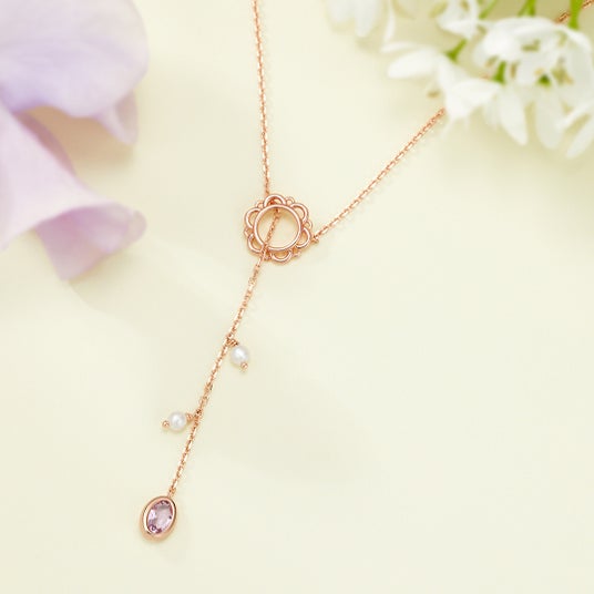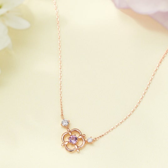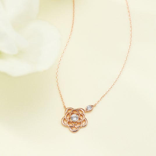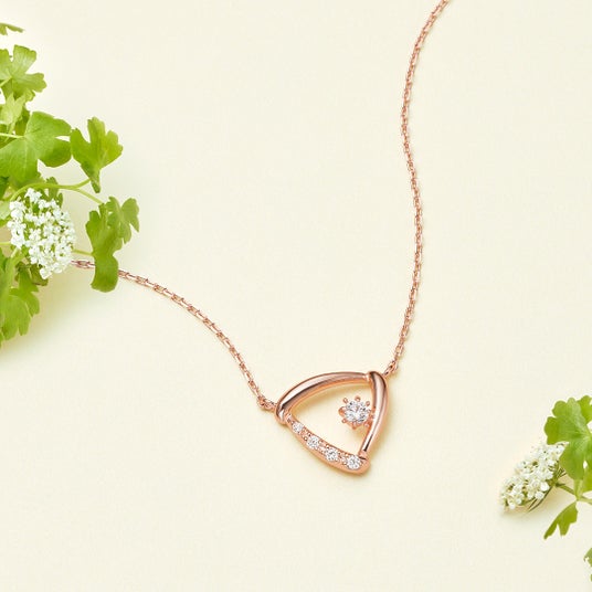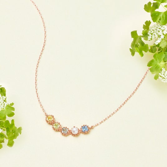 なりたい自分を写し出す「ミラー」を手鏡のかたちのフレームで表現した、身に着ける人の内面に寄り添った春らしいジュエリーシリーズ。長さの異なるネックレスセットは2Way仕様で、パールのショートネックレスはチョーカー風に身に着けても、ロングネックレスはミラーモチーフを取り外してシンプルにデザインチェーンだけで着こなすのもおすすめです。鏡の柔らかいフリルのようなフレームとアメシスト、美しさを象徴するパールをあしらったデザインが、あなたの魅力をより可憐に彩ります。「誠実」の意味を持つホワイトトパーズを、「美」や「愛情」の花言葉を持つバラモチーフの立体的な愛らしいフォルムで仕上げたネックレス、ピアスも。上品ながらも多彩なコーディネートに溶け込むデザインは、石言葉や花言葉とともに想いを届ける大切な人へのプレゼントにもおすすめです。