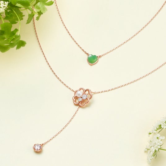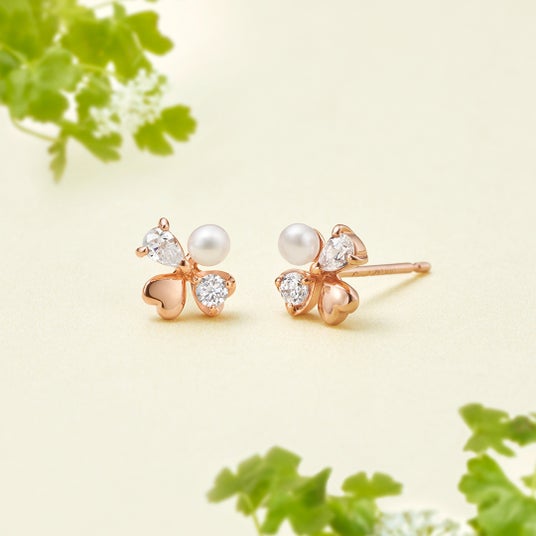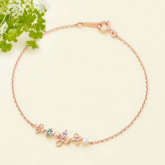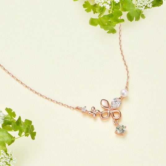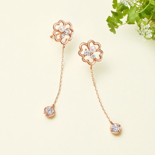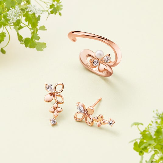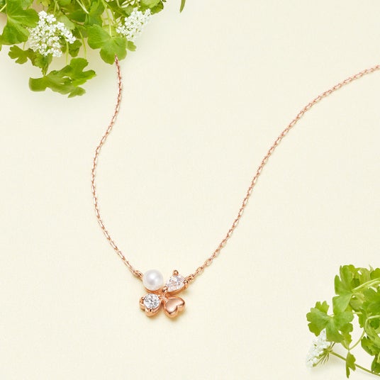 あたたかい春の訪れとともに幸せを届ける、四つ葉のクローバーモチーフの限定ジュエリーも。「癒し」や「平和」の意味を持つクリソプレーズをあしらった四つ葉のクローバーとピンクゴールドカラーのコンビネーションが春らしいデザインです。縁起の良いナナホシテントウが、パールの裏から愛らしく顔を覗くデザインを施したネックレスとピアスは、ささやかな幸運の願いが込められているのでデイリージュエリーにもおすすめです。