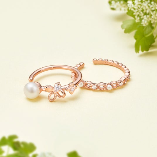 自分の好きなものにときめく感情を表現したハートモチーフや、大切な方との思い出を表現したカメラのシャッターに着想を得たジュエリーは、大切な人への贈り物にも。1セットでコーディネートが決まるピアスカフリングセットとリングカフセットは、クローバーモチーフとパールを合わせた、繊細で大人の愛らしさがあふれるデザインに仕上げました。