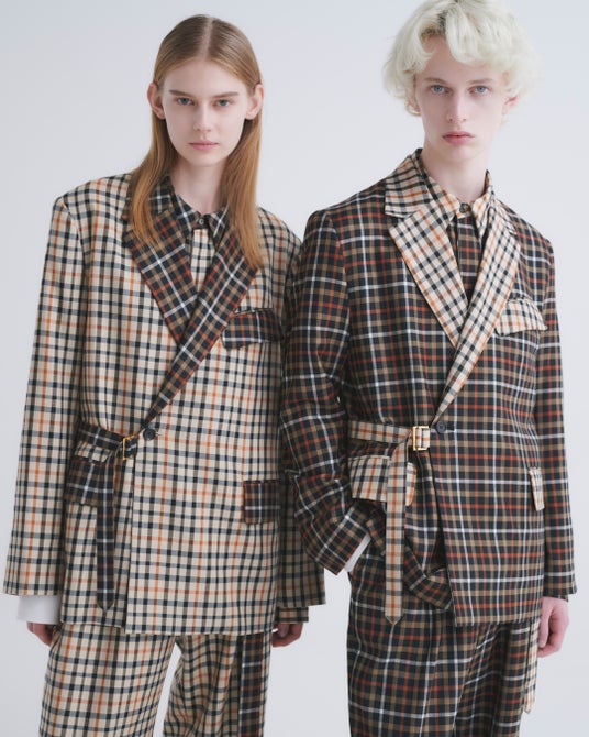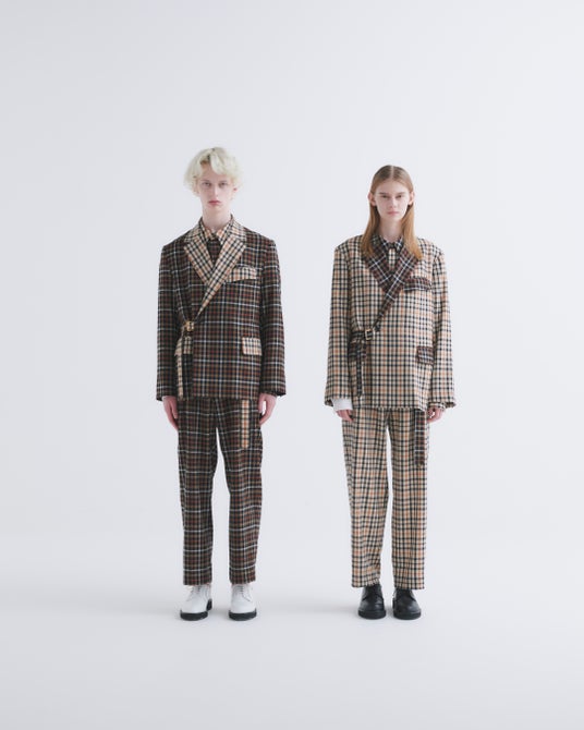 (左/右ともに)ジャケット¥85,800、シャツ¥49,500、パンツ¥52,800(価格は全て税込み価格)
