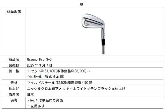 ミズノは、ツアープロのフィードバックを深く追求し、世界特許の製法による打感とソール設計『トリプルカットソール』を搭載したゴルフクラブ「Mizuno Pro S-3(ミズノプロ エススリー)」アイアンを3月7日に全国のミズノゴルフ取扱店で発売します。