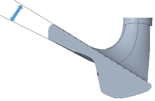 「Mizuno Pro S-3」アイアンは、キャビティ部分(下記オレンジ部分)を従来のハーフキャビティアイアン※1よりわずかに厚く設計する事でヘッドの剛性を高め、ハーフキャビティ構造ながらもマッスルバック構造に近い※2打球音を追求しています。