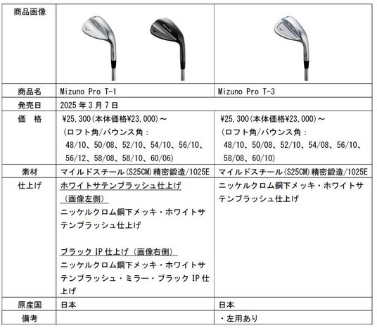 また、「Mizuno Pro S-3」アイアンと同じ製法、仕上げを採用し、ミズノが世界に誇る“打感”を踏襲したウエッジ2機種「Mizuno Pro T-1(ミズノプロ ティーワン)」「Mizuno Pro T-3(ミズノプロ ティースリー)」も合わせて発売します。