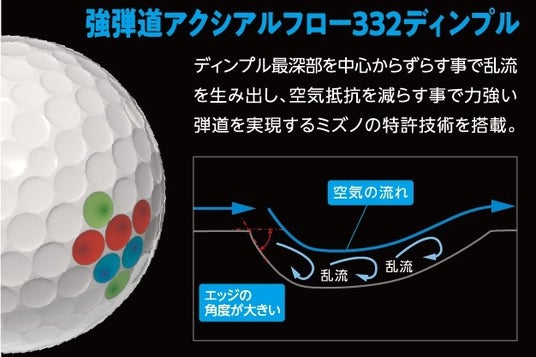 『アクシアルフローディンプル』は、ディンプルの最深部を中央から少しずらすことで乱流を生み出し、空気抵抗を減らすことで力強い弾道を生み出すミズノ独自の特許技術です。