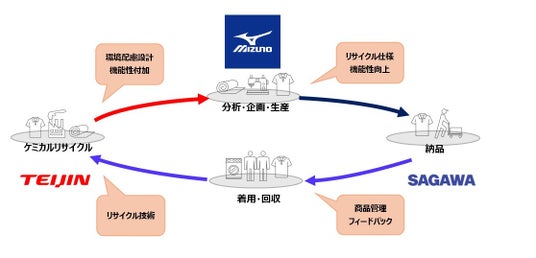 佐川急便株式会社(本社:京都市南区、代表取締役社長 笹森 公彰、以下「佐川急便」)と、ミズノ株式会社(本社:大阪市住之江区、代表取締役社長 水野 明人、以下「ミズノ」)および、帝人フロンティア株式会社(本社:大阪市北区、代表取締役社長執行役員 平田 恭成、以下「帝人フロンティア」)は、サステナブルな社会の実現に向け、佐川急便の使用済みユニフォームを新たなユニフォームへと循環させる「資源循環スキーム」(以下:本スキーム)のトライアル運用を開始しました。この取り組みは、佐川急便の「環境理念・環境方針」に基づく3R(リデュース・リユース・リサイクル)活動の長年の取り組みと、ミズノが有する製品設計や広域認定事業者※1としてのノウハウ、および帝人フロンティアが長年培ってきたポリエステルリサイクルや素材開発の技術力、資源循環の取り組みの知見を活用し、後の本格展開に向けた実証段階として位置づけています。