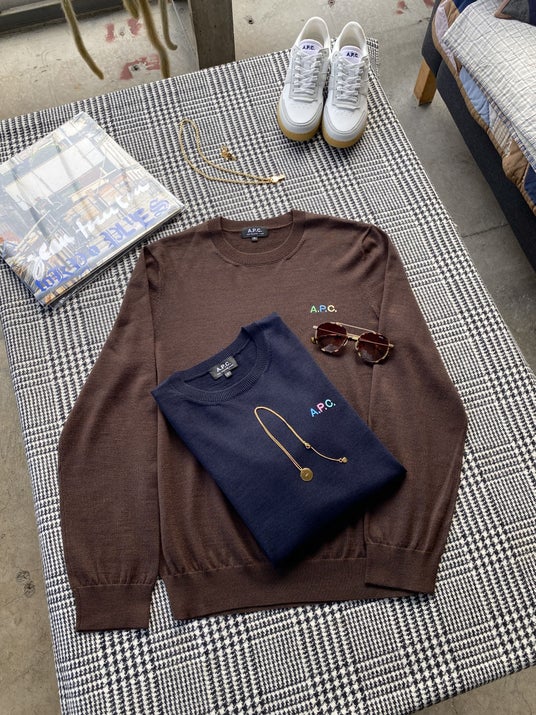 胸元にはペールトーンのA.P.C.ロゴ刺繍をあしらい、ホリデーシーズンにぴったりな遊び心のあるデザイン。メンズ/ウィメンズで共通の素材を使用し、ロゴ刺繍の色が異なる仕様になっています。パートナーとのリンクコーディネートに取り入れてみては。