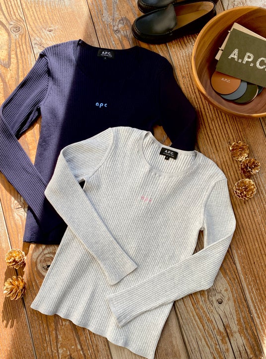 Suzy セーター定番のロゴデザインにはないスペシャルなapc小文字のロゴ刺繍をあしらった、すっきりした縦長のラインはミニマルで飽きの来ないシルエット。