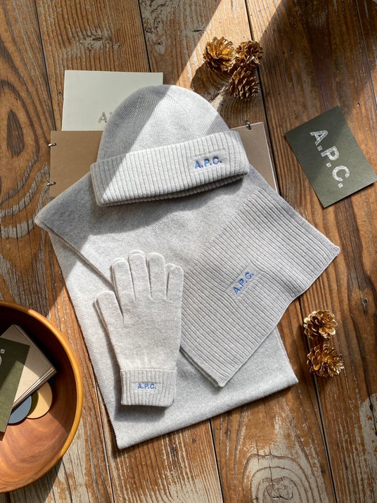 Thun マフラー Thiers ニットキャップ Tyrol 手袋 杢ペールベージュソフトで暖かなメリノウールを使用したA.P.C.ロゴ入りマフラー、ニットキャップ、手袋。