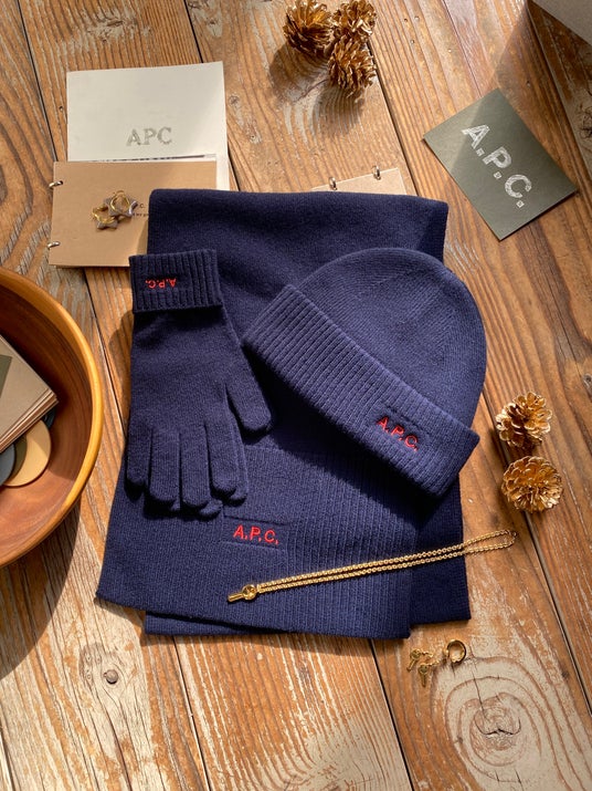 Thun マフラー Thiers ニットキャップ Tyrol 手袋 ダークネイビーソフトで暖かなメリノウールを使用したA.P.C.ロゴ入りマフラー、ニットキャップ、手袋。