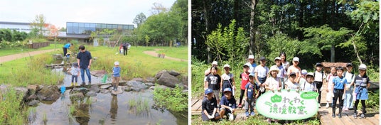 左)「わくわくトープ」の昆虫生息調査 右) 環境学習イベント