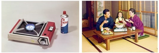 カセットこんろ初号機「イワタニホースノン・カセットフー」と、カセットこんろを使う家族の食卓