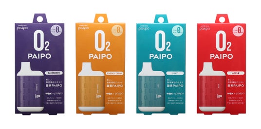 本体全体にO2PAIPOのロゴをデザインしたスクエア形状が特長で、フレーバーは第1弾同様のブルーベリーとエナジードリンクに加え、新フレーバーとして、ミント、アップルの4種類をラインナップ。