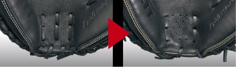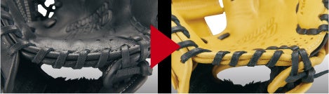3.小指つけ根ヒンジ部改良(キャッチャーミット)キャッチャーミットのヒンジ部紐3列⇒中央紐を抜き、2列にすることで柔軟性をアップしました。