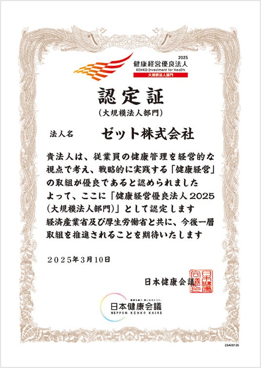 ゼット株式会社(本社/大阪市天王寺区、代表取締役社長/渡辺裕之)は、3月10日、経済産業省および日本健康会議が共同で優良な健康経営を実践している法人を認定する「健康経営優良法人2025 (大規模法人部門)」に認定されました。