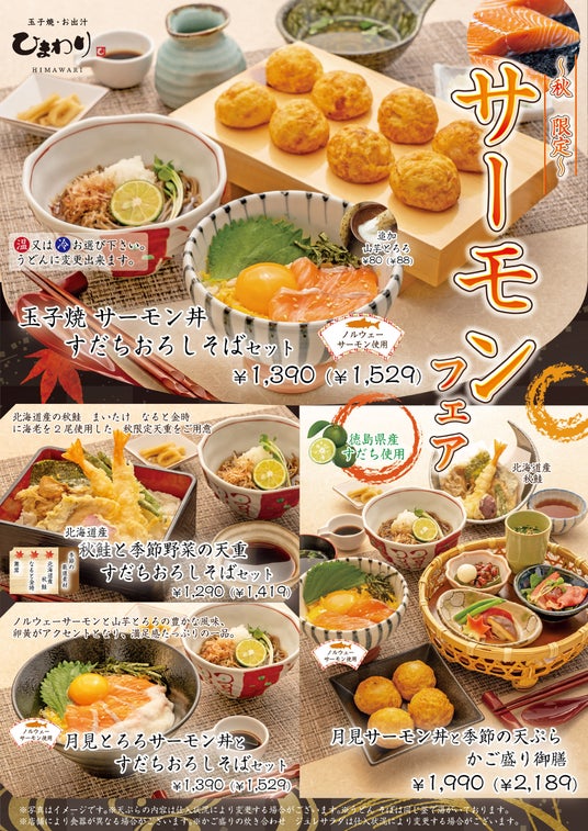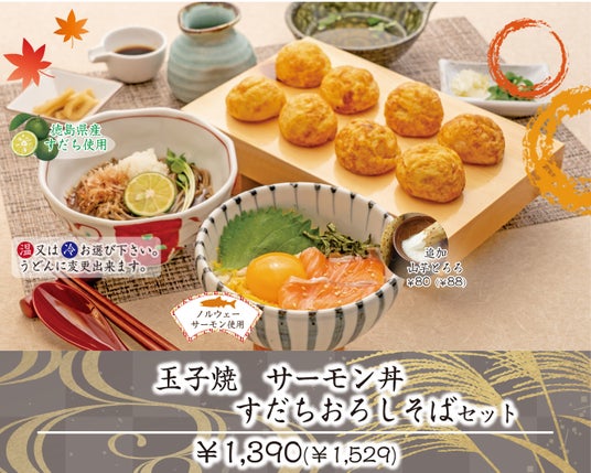 秋が旬のサーモンに名物玉子焼(明石焼)、すだちの香りと酸味が食欲をそそるすだちおろしそば、サーモン丼には卵黄をトッピングし、特製海鮮醤油でお召し上がりください。