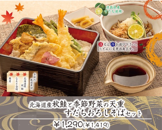 ・秋鮭と季節野菜の天重 すだちおろしそばセット 1,290円(税込み1,419円)