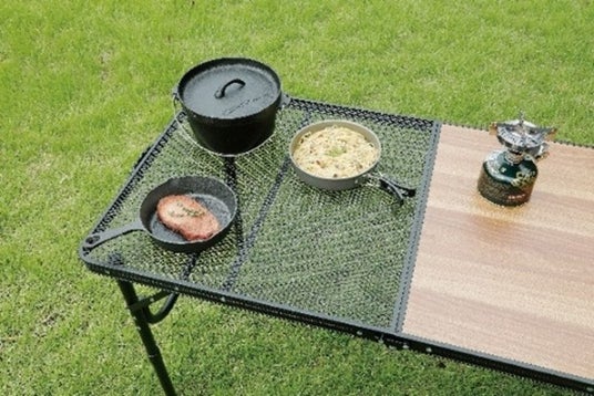 テーブルの天板は、熱に強いメッシュ天板とボードの組み合わせを採用。メッシュ天板には熱い鍋などを直接おいても、焼けてしまうことはありません。