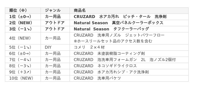 第1位はCRUZARDの水アカ汚れピッチ・タール洗浄剤。2024年総合ランキングで1位になって以降、その人気は現在も継続中です。今回、なんと2位の倍以上のアクセス数を稼ぎ、堂々のランキングTOPとなりました。ピッチ・タール汚れやヘッドライトの黄ばみなどがよく落ちる濃縮タイプのプロ仕様アルカリ洗浄剤です。