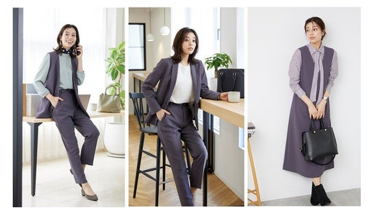 昨今、家電や料理グッズなど様々なジャンルで『タイパ』を重視する消費スタイルがトレンドワードとなっています。そこで、働き方が多様化し選択肢が増えてきている仕事服のコーディネートに対する悩みを解消すべく、オフィスワークやテレワーク、外出など様々なシーンに対応し、忙しい朝に簡単にスタイリングが完成する『タイパ』に優れた「カセット服」を企画しました。カセット服は、スーツのように同色同素材で揃えることのできるアイテムで、今回はテーラードジャケット・テーパードパンツ・ワイドパンツ・ジレ・ワンピースの5型を用意しています。