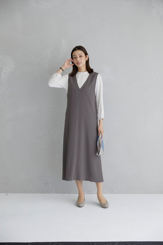 仕事服が多様化する中で、「簡単にコーディネートが決まる、着回しできるアイテムが欲しい」というお客様の声が上がっていることから、ビジネスシーンで定番的に使われているワンピースをカセットアイテムとして初めて取り入れました。ポイントは程よい深さのVネックデザインで、インナーにフリルブラウスを合わせて華やかな印象や、シンプルなシャツと合わせてスッキリ大人カジュアルな印象にもできるなど様々なバリエーションの着こなしが可能です。