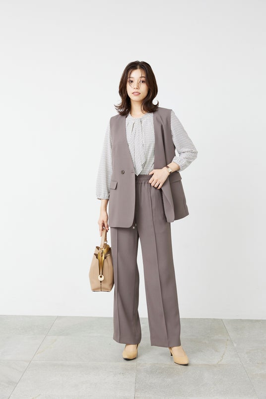 販売価格:テーラードジャケット 15,290円/テーパードパンツ 6,600円/ワイドパンツ 6,600円/ジレ 11,000円/Vネックワンピース 12,100円 ※すべて税込