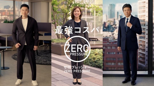 今回のCMでは、インナーにTシャツを合わせリラックス感のあるビジネスカジュアルスタイルのなかやまきんに君さん、ブラックのインナーにパンツスタイルで大人かっこいい石川さん、タイドアップできちんと見えするセットアップスタイルの三浦さんの3名が登場します。名刺交換や同僚とのランチ、商談など様々なビジネスシーンにおいて、ストレッチやウォッシャブルなどあったらうれしい機能とともに、上下税込9,900円という「ゼロプレシャースーツ」のコストパフォーマンスの高さを最大限に訴求する内容となっています。