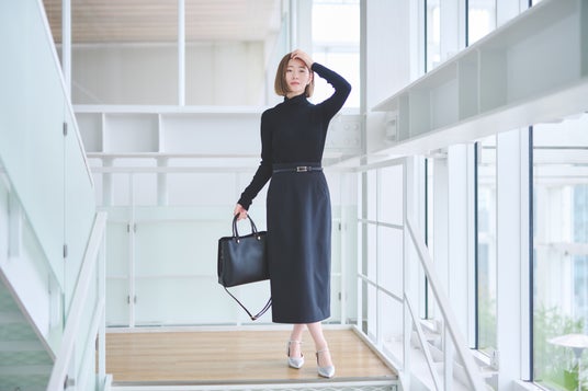 デザインは身頃の編み目を太くし両サイドを細く設計することで、縦のラインを強調し横幅が細く見える目の錯覚を利用。変化をつけた編み目は太さが近いとなじんで着やせ効果が薄くなり、また幅の差を大きくするとバストが強調されてしまうことからミリ単位で試行錯誤を重ね、スタイルが良く見えビジネスシーンでも利用しやすい上品なバランスに調整しました。さらに長年ビジネスウエアに携わってきた青山だからこそ、ジャケットの中でもごわつかず1枚で着ても体のラインを拾いすぎない美しいシルエットに仕上げています。