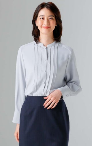 デザインはバンドカラーピンタックとボウタイの計2型を用意しました。バンドカラーは、前立てにくるみボタンを採用したことに加え、襟元は少し立たせながらもデコルテが上品に見えるよう設定。ボウタイは、ボリューム感のある首元が特徴で、リボン結びで大人可愛い印象にも、サイドで結んでエレガントな印象にもなるなど様々な雰囲気を楽しめます。会議や商談などのビジネスシーンでも安心な着回し力の高いアイテムとなっています。