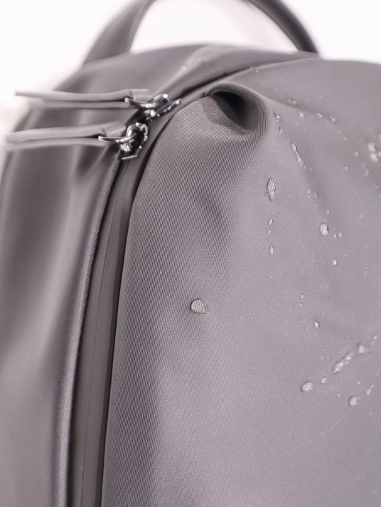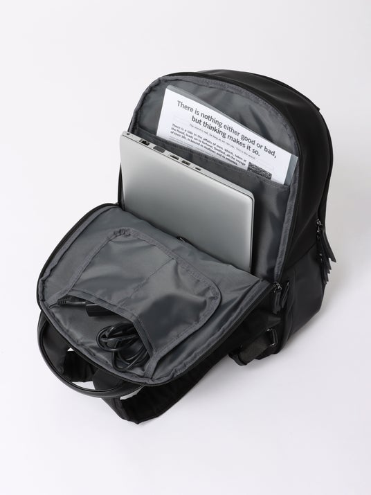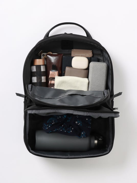 ビジネスリュックの下段スペースは、お弁当箱やジム用スニーカーを収納することも可能な、汎用性のあるサイズで設計しています。奥行きを11.0cmと厚みを抑えることで場所を取りにくく、混雑する電車の中でもストレスを軽減します。また、生地表面にはフッ素を使用せず環境に優しい撥水加工を施した他、水が入りにくいコーディングファスナーを採用することで、雨の日でも安心して持ち運べる仕様にしました。