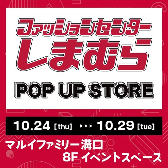 株式会社しまむら(本社所在地:埼玉県さいたま市大宮区北袋町1-602-1、代表取締役:鈴木 誠)は、10月24日(木)よりマルイファミリー溝口にて、POP UP STOREを出店します。インフルエンサーとコラボした新作商品の先行販売やノベルティなど、多数のお楽しみ頂ける内容をご用意しています。ご来店を心よりお待ちしております。