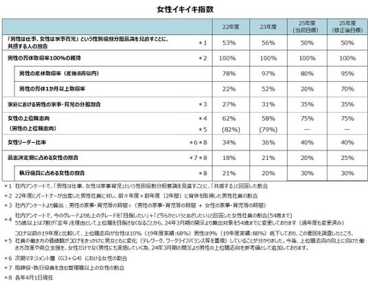 経営の基盤となる企業文化を古いものから更新するために「企業理念の制定・浸透」「働き方改革」「多様性の推進」「手挙げの文化の醸成」といった取り組みを同時に進め、「多様性の推進」については、“画一的な組織からはイノベーションは生まれない”という考えのもと、男女・年代・個人の3つの多様性を掲げ、組織改革を推進してまいりました。2013年度より女性活躍の重点指標として「女性イキイキ指数」を設定、2025年度までの目標数値を掲げ、取り組みを可視化しております。